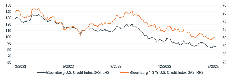 Fed policy continued to dominate the fixed income market narrative during the quarter. While the Fed continued to communicate a desire to ease policy at some point in 2024, stubborn inflation and a seemingly invincible labor market pushed expectations for rate cuts largely to the back half of the year. Unlike several prior instances over the last couple years, rising UST yields did not catalyze risk-off market conditions during the first quarter. Rather, equity markets surged to new heights, and credit spreads fell to levels last seen during the zero-rate policy years of 2020-2021.