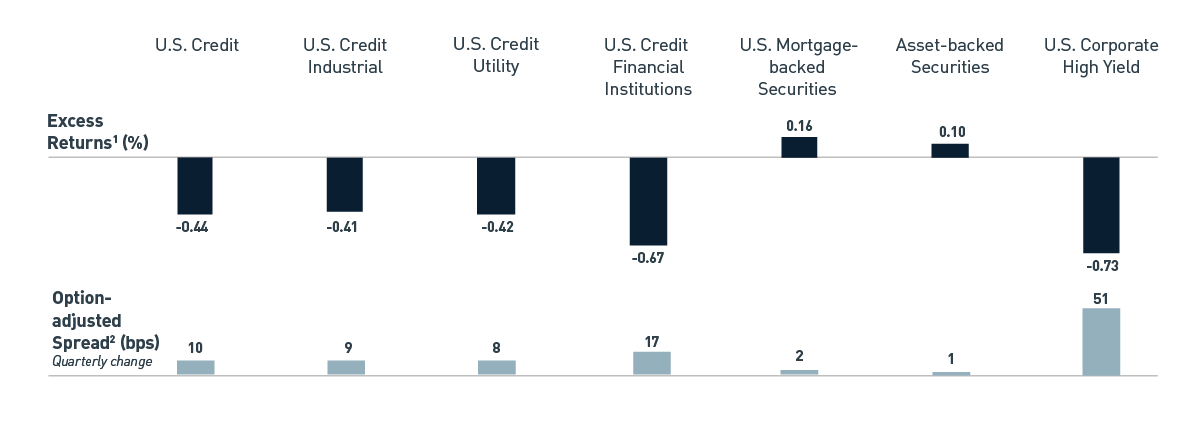 Figure 1. First-quarter Sector Excess Returns and Option-adjusted Spreads of Bloomberg U.S. Aggregate and U.S. Corporate High Yield Indices