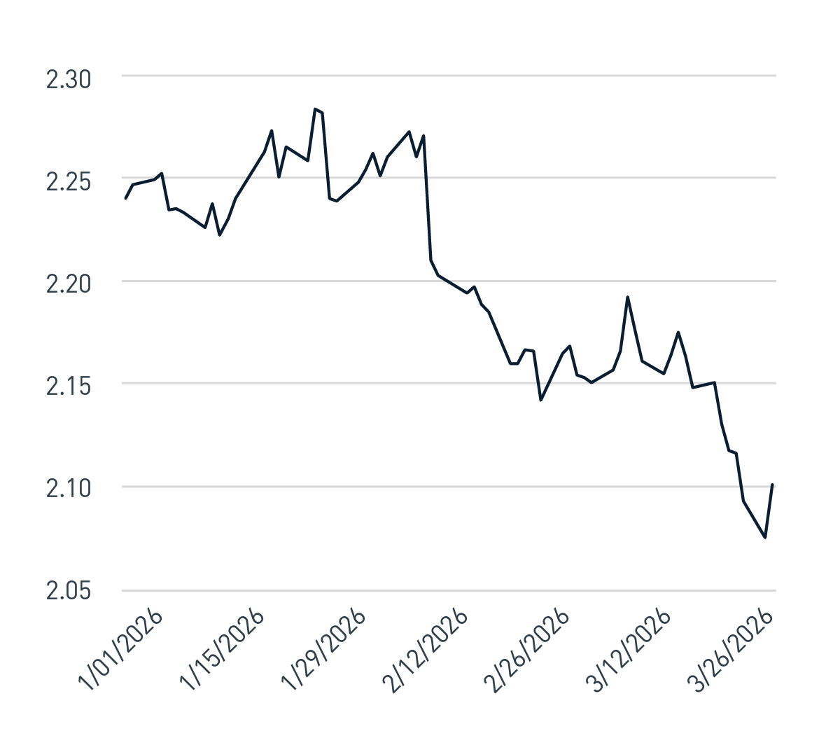 With the labor market in a delicate state of balance and concerns about inflationary pressures resuming, we expect the Fed to remain cautious in adjusting policy. At the same time, the ongoing costs of the conflict will put additional stress on an already challenged fiscal budget and likely keep UST rates elevated.